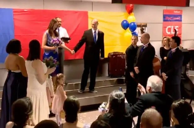 Desde entonces, Belleau se mudó a California con Peterson y la pareja tiene dos hijas juntos, pero decidieron volar de regreso al especial aeropuerto donde comenzó todo. Belleau dijo que fue necesario convencer a los funcionarios del aeropuerto para que ella y Peterson pudieran celebrar su boda de 125 invitados en el área de recolección de equipajes, pero finalmente aprobaron la ceremonia.