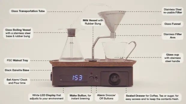 Según cuenta su creador en la campaña de Kickstarter, la idea del reloj cafetera fue inspirada por la psicología detrás del sueño, y las rutinas que propician un mejor descanso por la noche.