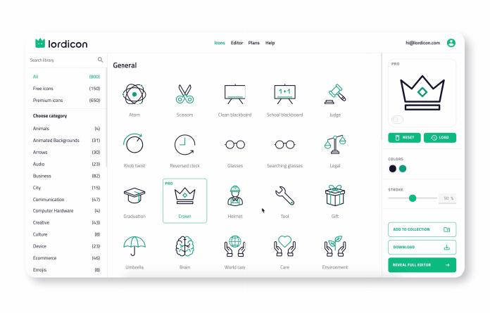 La herramienta permite editar una colección completa de íconos, personalizando los colores, tamaño de trazo y relleno.