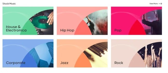La página agrupa videos de archivo, música y plantillas Premier Pro en una variedad de categorías, que incluyen naturaleza, estilo de vida, negocios, animales, comida, transporte y más.