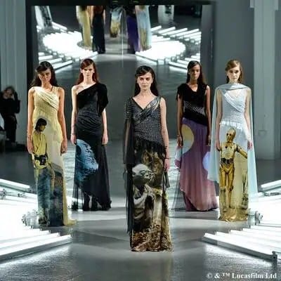 En los diseños de estos cinco vestidos que fueron exhibidos en una de las pasarelas de moda más esperadas por los amantes de la moda, pueden reconocerse a los personajes de la película que fueron homenajeados: Luke Skywalker, C-3PO y Yoda. A su vez, las dos prendas restantes fueron pensadas para recrear a la «Estrella de la Muerte» y a los dos soles del planeta Tatooine, respectivamente.